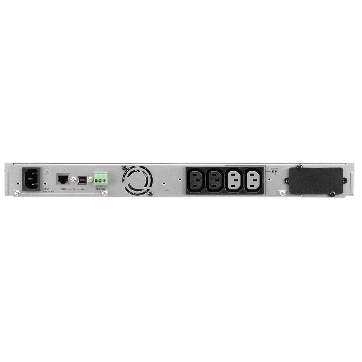 Connecteur d'entrée IEC C14. Connecteurs de sortie : 4 x IEC C13. Courant électrique max 10A. Autonomie max : 12min. Contrôle par USB ou RS-232.