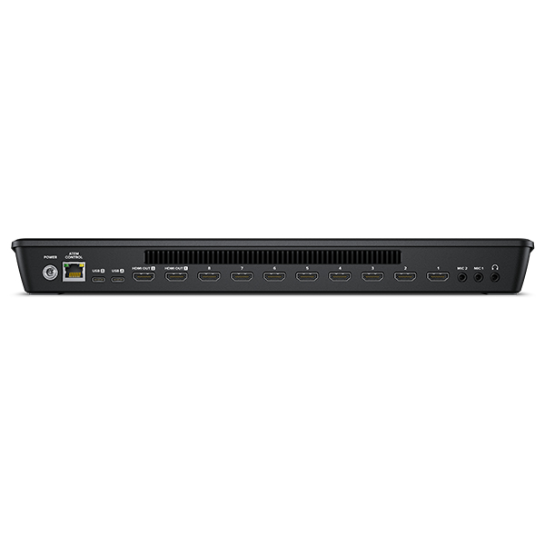 8 entrées HDMI + 2 x micro Mini Jack 3,5mm - Sorties : 2 x HMDI + 2 x USB 3.1 Type C Gen 1 pour enregistrement sur HDD externe