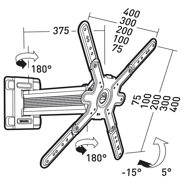 Compatible VESA 300x300, 400x400 Inclinable à +5/-15° - Orientable via deux articulations à 180° - Charge max. : 30kg