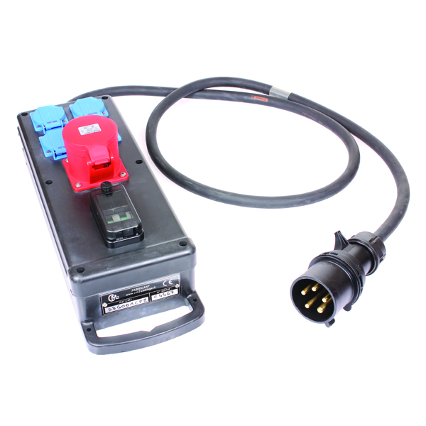 Câble H07RNF 5G6 fiche mâle CEE17 3P+N+T 32A 2 mètres. 4 socles bleus 10/16A NF protégés par 2 disjoncteurs 16A. Socle droit 32A 3P+N+T CEE17 non protégé. Prévoir 30mA en amont.