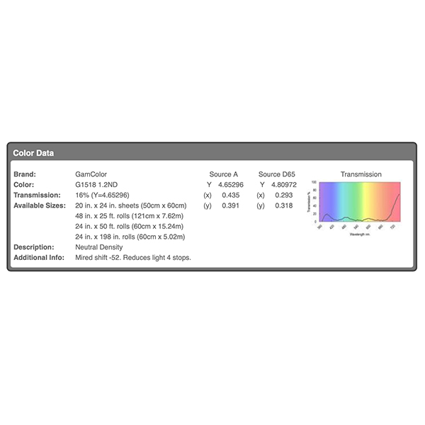 Filtre gélatine GAMCOLOR 1518 correcteur 1.2ND - Feuille 65 x 61cm