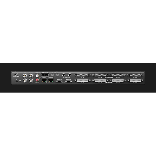 32 canaux analogiques I/O (sub-d25), 64 canaux numériques via DANTE I/O, HDX I/O, MADI I/O, 8 canaux via ADAT I/O, 2 canaux via SPDIF I/O. Word clock I/O, Thunderbolt 3