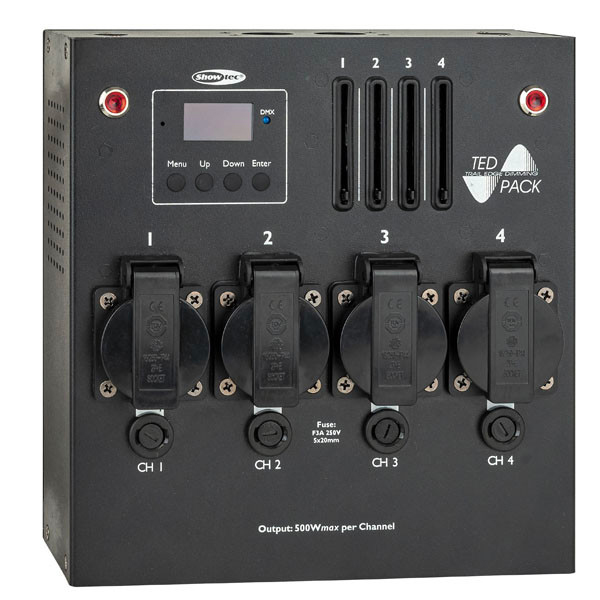 Version spéciale française avec sortie prises 16/10A NF - Fader de gradation sur la facade - Alimentation en powerCON - DMX In/Out 3 points