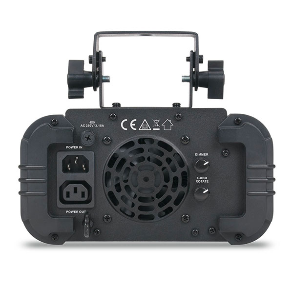 Dimensions (LxlxH): 236x236x215mm Gobo taille D / Dimensions gobo : 54mm, visible : 40mm - Livré avec une télécommande UC-IR
