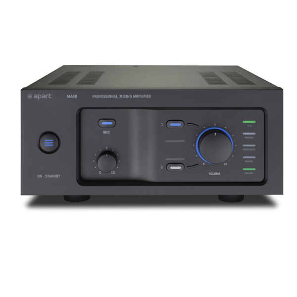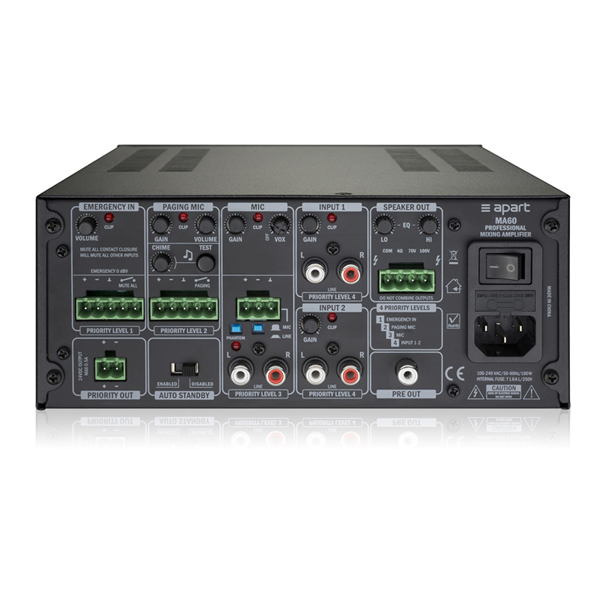1 entrée MIC/LINE, 2 entrées stéréo, 1 entrée pour micro d'appel, 1 entrée/sortie prioritaire d'urgence. Refroidissement par convection, silencieux.