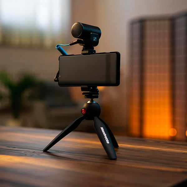 Kit comprenant : micro MKE200, trépied Manfrotte PIXI, pince smartphone avec griffe, cordons spiralés TRS et TRRS, bonnette anti vent fourrure et pochette.