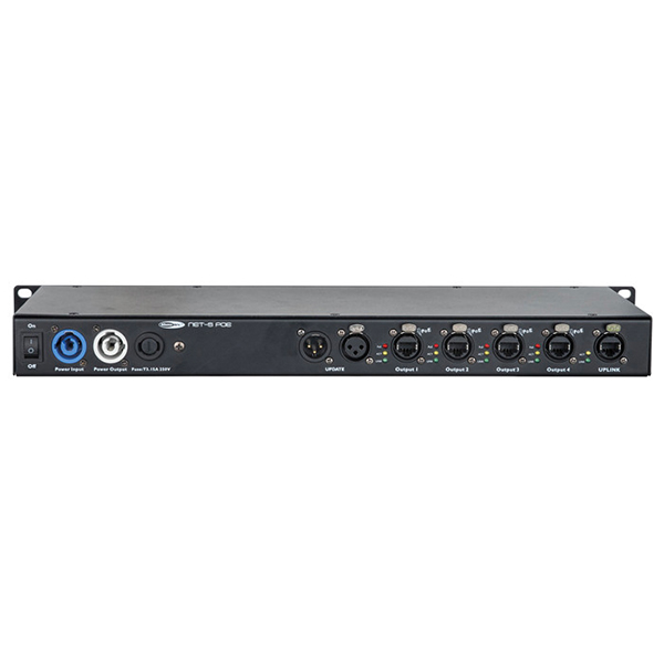 Alimetation via powercon. Connecteurs EtherCON.