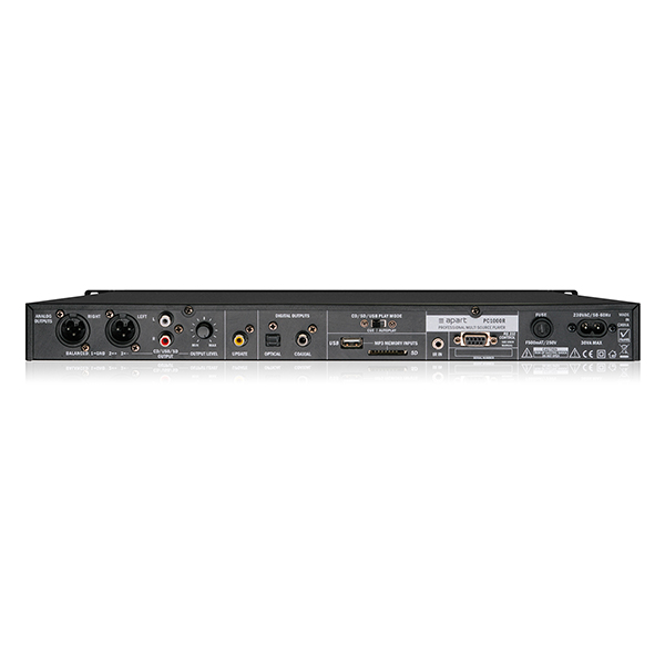 Rackable 1U, télécommande incluse Sortie sur XLR, RCA ou SPDIF (coaxial ou optique). Ports USB et SD en façade et à l'arrière. Port RS-232C. Compatible MP3 et WMA.