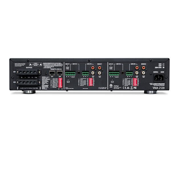 5 entrées (4 + music) RCA ou bornier. Lecteru multimédia en façade et contrôle du niveau de sortie général de chacune des 2 zones.