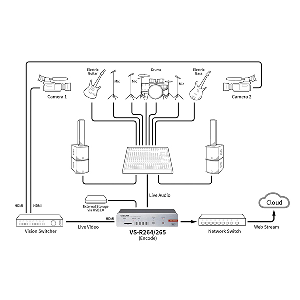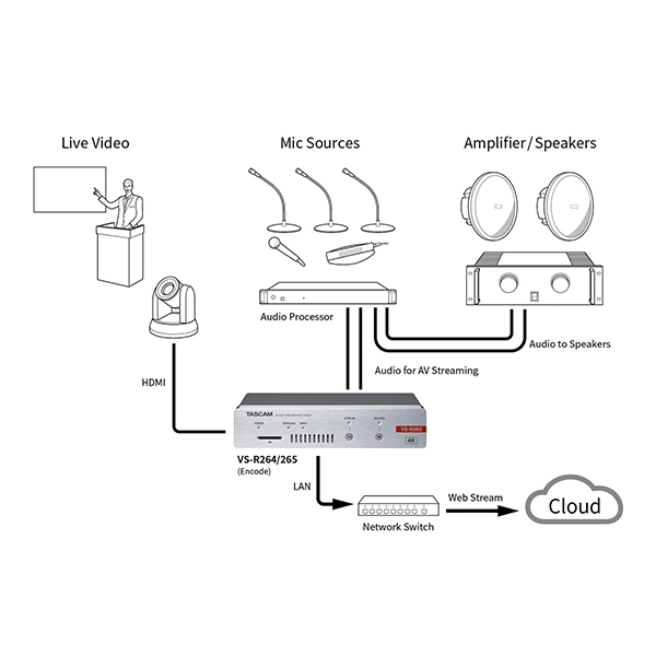 Le VS-R265 et le VS-R264 sont des encodeurs/décodeurs pour streaming audio/vidéo sur IP (AV-over-IP) assurant simultanément l’encodage, le streaming, l’enregistrement et le décodage de contenus audio/vidéo de résolution 4K/UHD ou Full HD en utilisant des codecs vidéo H.265/HEVC ou H.264. Ils s’utilisent pour des transmissions sur des réseaux d’entreprises ou distants (WAN), ou pour le streaming en direct sur Internet, avec téléversement (upload) automatique via FTP des fichiers enregistrés sur une solution de stockage réseau. Les deux modèles utilisent des formats de streaming et des protocoles ouverts, sont compatibles avec les réseaux de diffusion de contenus (CDN, Content Delivery Networks) et les plates-formes en ligne diffusant en direct comme YouTube, Wowza, Ustream, AWS Elemental MediaLive, CloudFront, etc. Ces appareils sont extrêmement polyvalents : alimentation via PoE (Power over Ethernet) ou tension externe 12 V, entrée/sortie HDMI avec embeddage/désembeddage audio, contrôle intégral depuis une API RESTful pour intégration facile dans des systèmes d’automation et de contrôle. Alors que nombre d’autres produits comparables sont dépourvus de connecteurs audio professionnels, ou ne travaillent pas au niveau audio pro, ou n’enregistrent pas, ou ne peuvent pas encoder et décoder simultanément, les Tascam VS-R264 et VS-R265 proposent des entrées/sorties audio entièrement symétriques sur connecteurs Euroblock, avec niveau de référence commutable pour assurer la compatibilité avec tous les systèmes audio professionnels. Des mini-jacks 3,5 mm stéréo asymétriques sont également prévus pour utilisation avec des appareils grands public. Les fonctions de transferts audio/vidéo bidirectionnel, de streaming en ligne en direct et d’enregistrement fiable sur carte SD pour téléversement ultérieur sur un site Web sont idéales dans de nombreuses applications : événements live, présentations/conférences, sessions parlementaires, présentations en conseil d’administration, salles de concert, lieu de culte, et aussi pour des liaisons entre salles ou emplacements distants. Le format demi-largeur de rack permet de monter en rack deux appareils côté à côte, en n’occupant qu’1 U de hauteur. On peut aussi les poser sur une table ou les visser sous une surface quelconque, grâce à la fixation livrée.