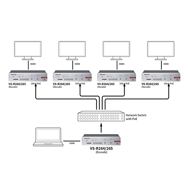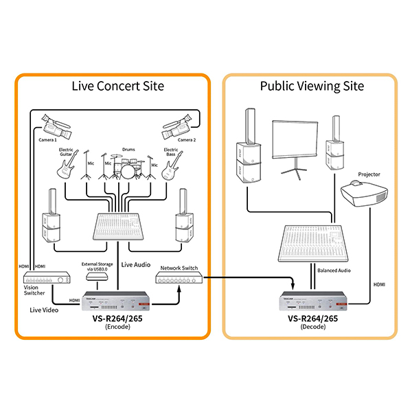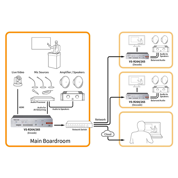 Le VS-R265 et le VS-R264 sont des encodeurs/décodeurs pour streaming audio/vidéo sur IP (AV-over-IP) assurant simultanément l’encodage, le streaming, l’enregistrement et le décodage de contenus audio/vidéo de résolution 4K/UHD ou Full HD en utilisant des codecs vidéo H.265/HEVC ou H.264. Ils s’utilisent pour des transmissions sur des réseaux d’entreprises ou distants (WAN), ou pour le streaming en direct sur Internet, avec téléversement (upload) automatique via FTP des fichiers enregistrés sur une solution de stockage réseau. Les deux modèles utilisent des formats de streaming et des protocoles ouverts, sont compatibles avec les réseaux de diffusion de contenus (CDN, Content Delivery Networks) et les plates-formes en ligne diffusant en direct comme YouTube, Wowza, Ustream, AWS Elemental MediaLive, CloudFront, etc. Ces appareils sont extrêmement polyvalents : alimentation via PoE (Power over Ethernet) ou tension externe 12 V, entrée/sortie HDMI avec embeddage/désembeddage audio, contrôle intégral depuis une API RESTful pour intégration facile dans des systèmes d’automation et de contrôle. Alors que nombre d’autres produits comparables sont dépourvus de connecteurs audio professionnels, ou ne travaillent pas au niveau audio pro, ou n’enregistrent pas, ou ne peuvent pas encoder et décoder simultanément, les Tascam VS-R264 et VS-R265 proposent des entrées/sorties audio entièrement symétriques sur connecteurs Euroblock, avec niveau de référence commutable pour assurer la compatibilité avec tous les systèmes audio professionnels. Des mini-jacks 3,5 mm stéréo asymétriques sont également prévus pour utilisation avec des appareils grands public. Les fonctions de transferts audio/vidéo bidirectionnel, de streaming en ligne en direct et d’enregistrement fiable sur carte SD pour téléversement ultérieur sur un site Web sont idéales dans de nombreuses applications : événements live, présentations/conférences, sessions parlementaires, présentations en conseil d’administration, salles de concert, lieu de culte, et aussi pour des liaisons entre salles ou emplacements distants. Le format demi-largeur de rack permet de monter en rack deux appareils côté à côte, en n’occupant qu’1 U de hauteur. On peut aussi les poser sur une table ou les visser sous une surface quelconque, grâce à la fixation livrée.